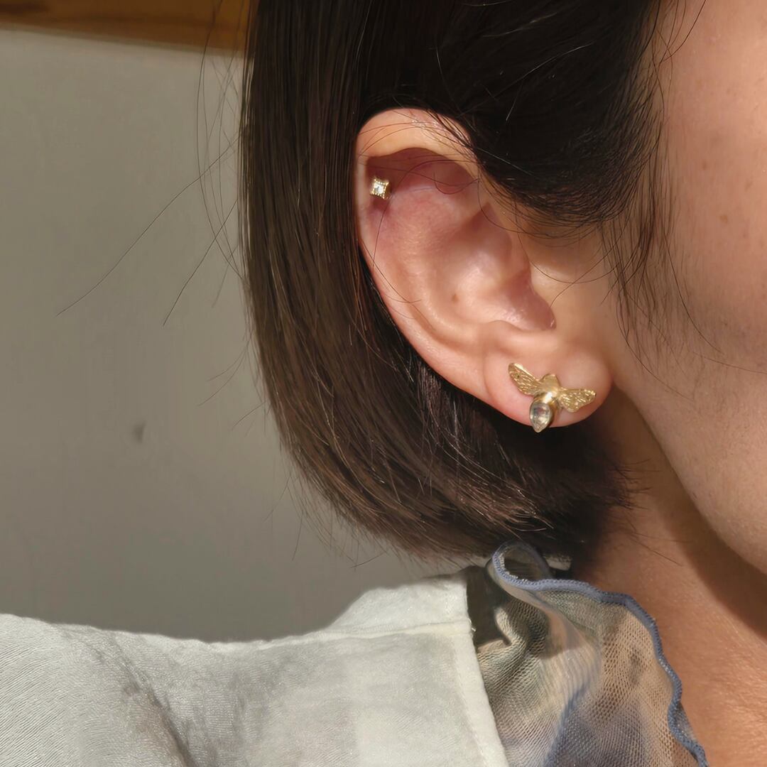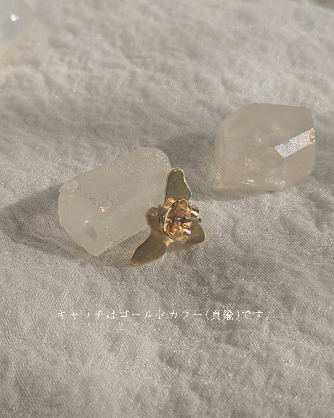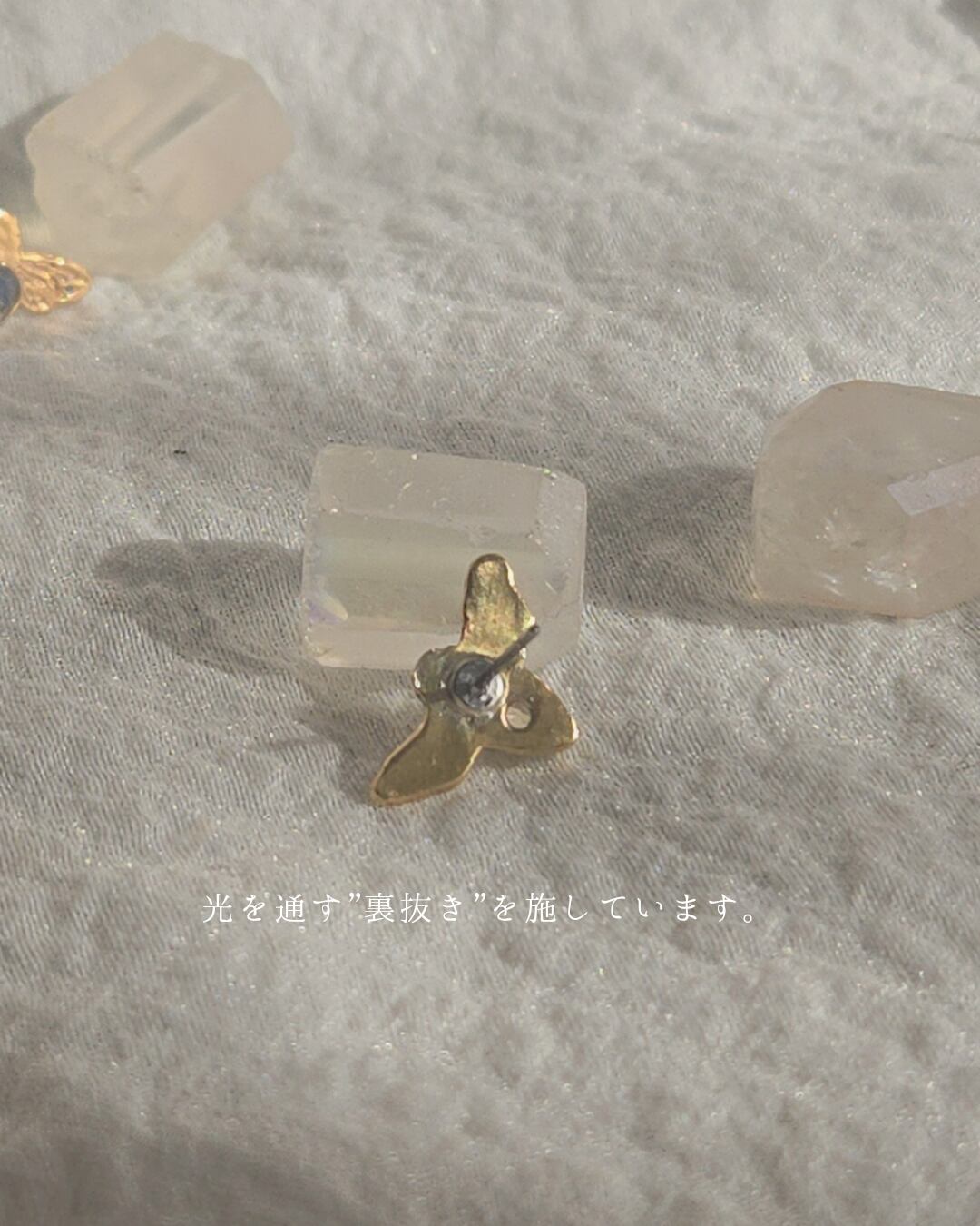 素材: 真鍮(本体、キャッチ)、ピアスポスト(ステンレス)、天然石(レインボームーンストーン)