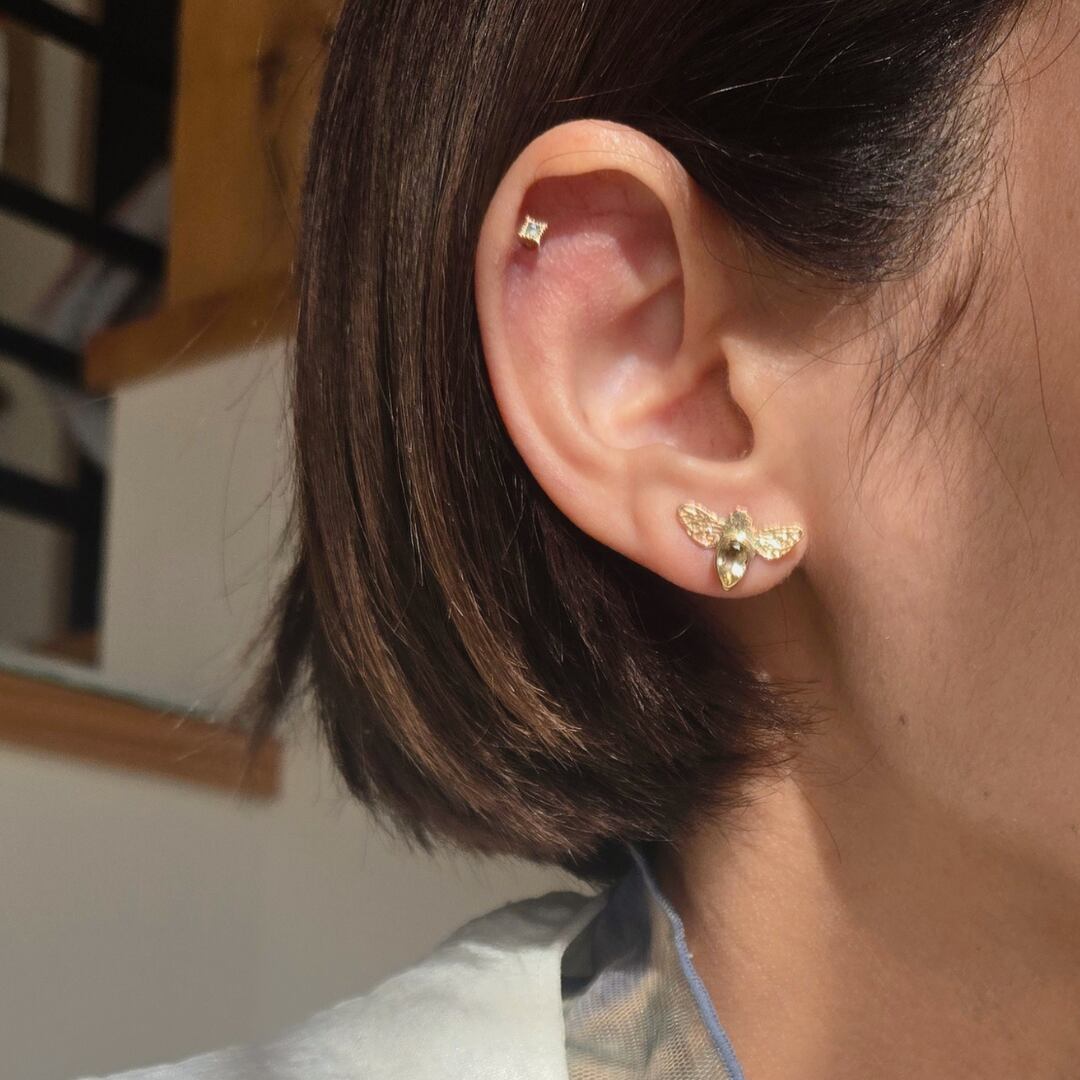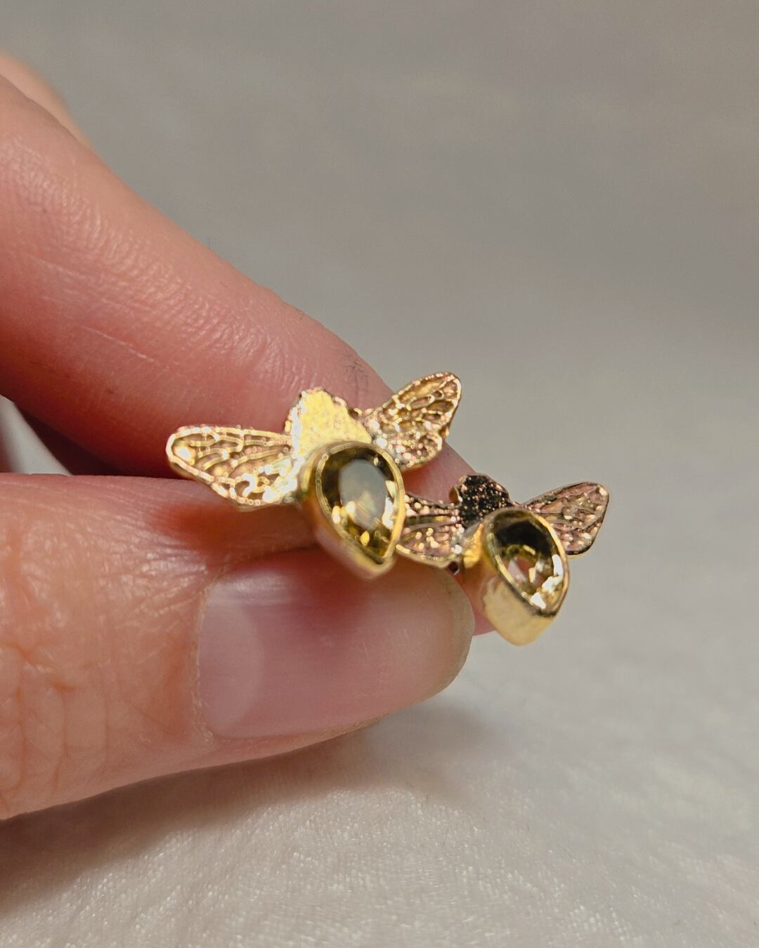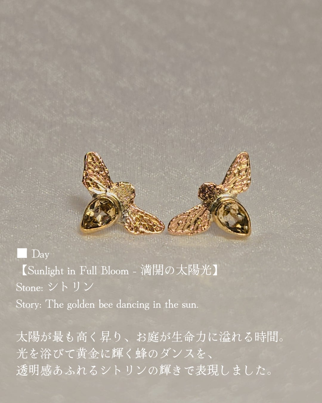 太陽が最も高く昇り、お庭が生命力に溢れる時間。光を浴びて黄金に輝く蜂のダンスを、透明感あふれるシトリンの輝きで表現しました。